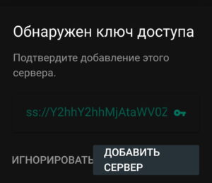Открываем приложение Outline. Если на момент запуска приложения ключ доступа уже находится в буфере обмена, то Outline сам его обнаружит и предложит подключить. Просто нажмите ДОБАВИТЬ СЕРВЕР.